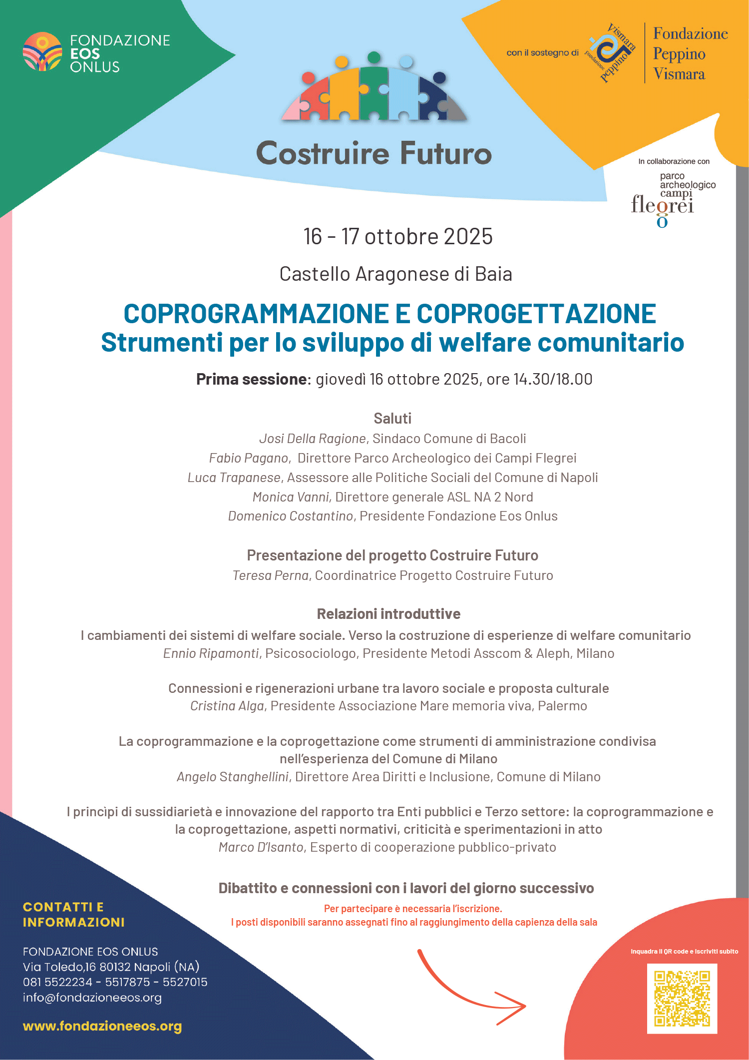 siamo lieti di invitarvi al workshop “Coprogrammazione e coprogettazione. Strumenti per lo sviluppo di welfare comunitario”, che si terrà il 16 e 17 ottobre 2025 presso il Castello Aragonese di Baia (NA).